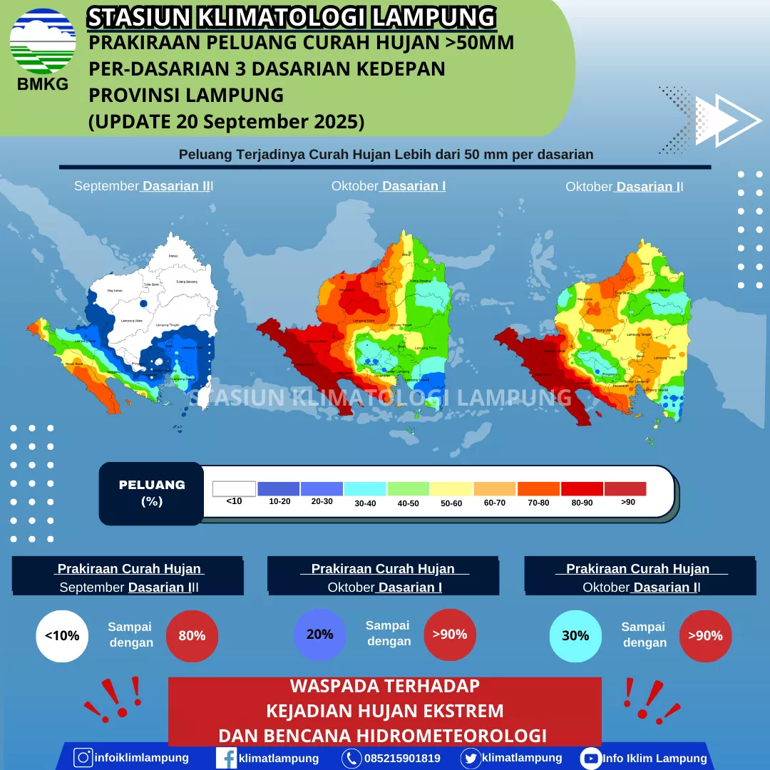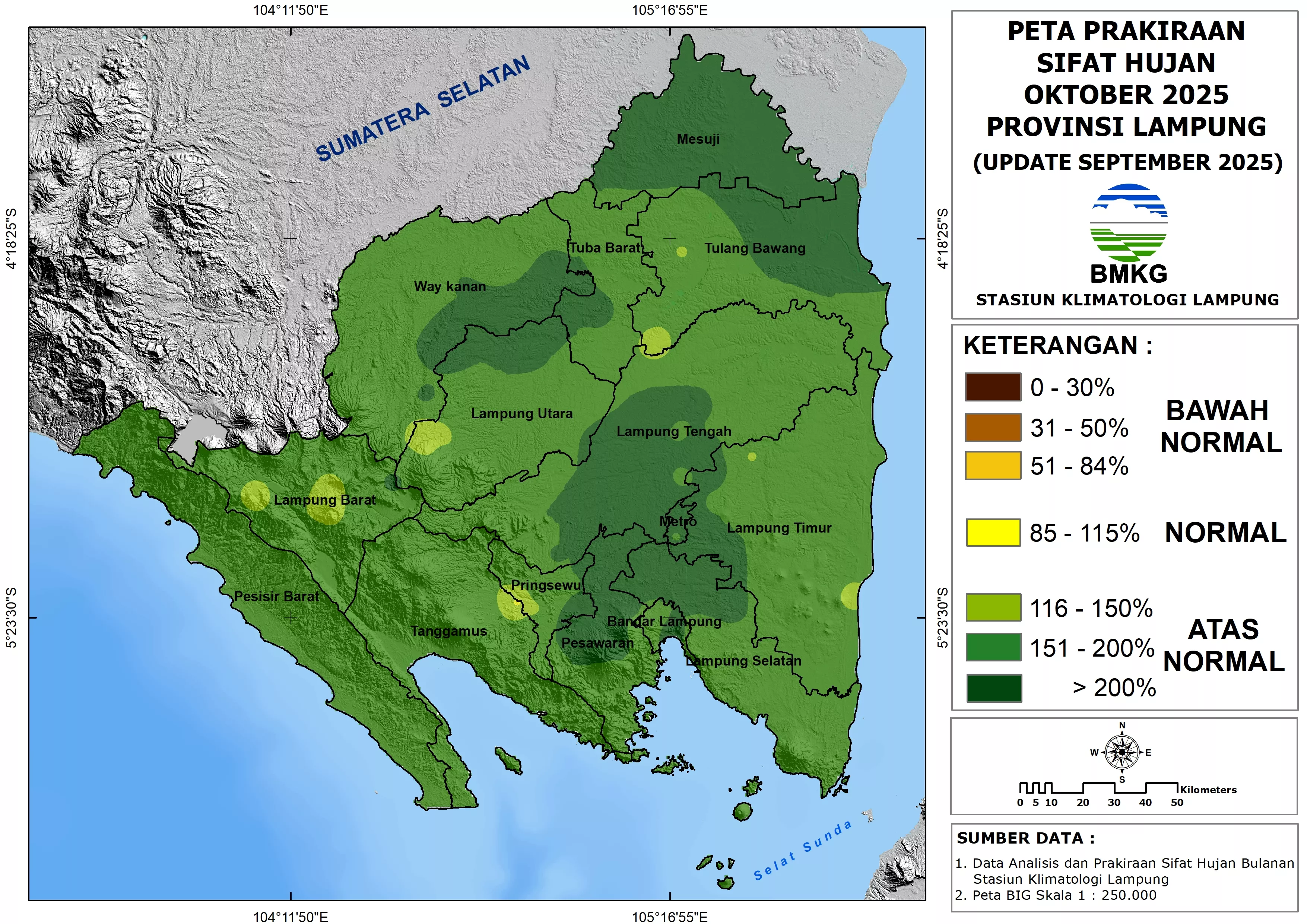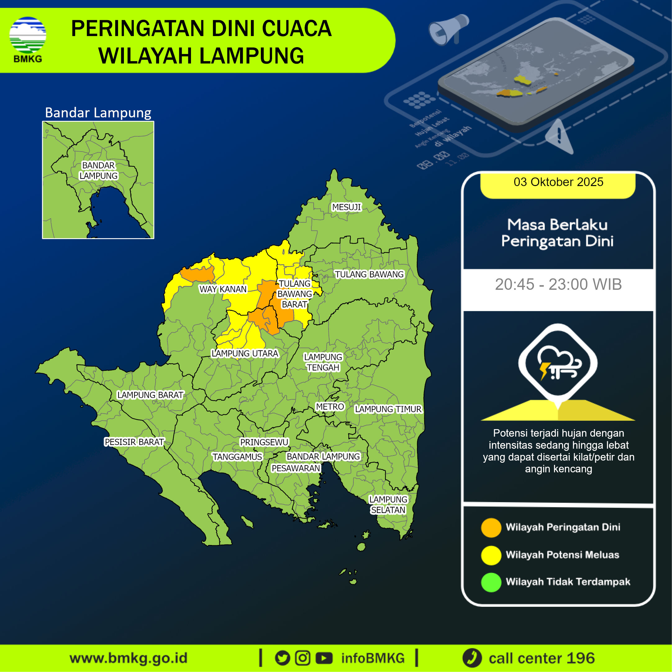 UPDATE Peringatan Dini Cuaca Wilayah Lampung tgl 03 Oktober 2025 pkl. 20:28 WIB berpotensi terjadi hujan dengan intensitas sedang hingga lebat yang dapat disertai kilat/petir dan angin kencang pada pkl 20:45 WIB di Kabupaten Lampung Utara: Muara Sungkai, Bunga Mayang, Kabupaten Way Kanan: Negeri Besar, Bumi Agung, Kabu.....