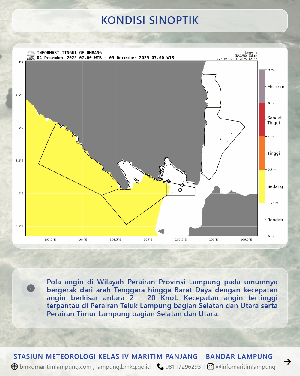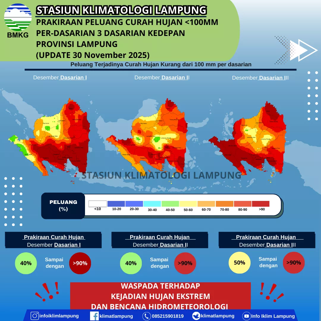 PRAKIRAAN CUACA PROVINSI LAMPUNG KAMIS, 04 DESEMBER 2025: Pagi hari: Diprakirakan cerah – cerah berawan. Berpotensi hujan di wilayah Mesuji, Tulang Bawang, Way Kanan. Siang–sore hari: Diprakirakan berpotensi hujan di sebagian besar wilayah Lampung. Malam hari: Diprakirakan berpotensi hujan di sebagian besar wilayah Lampung. Dini hari: Diprakirakan Berawan. Berpotensi hujan di wilayah Lampung Selatan, Tanggamus, Lampung Utara, Way Kanan, Tulang Bawang Barat, Mesuji. Suhu udara: Secara umum berkisar antara 23,0 °C – 32,0 °C, kecuali wilayah Lampung bagian barat (Lampung Barat, Pesisir B...