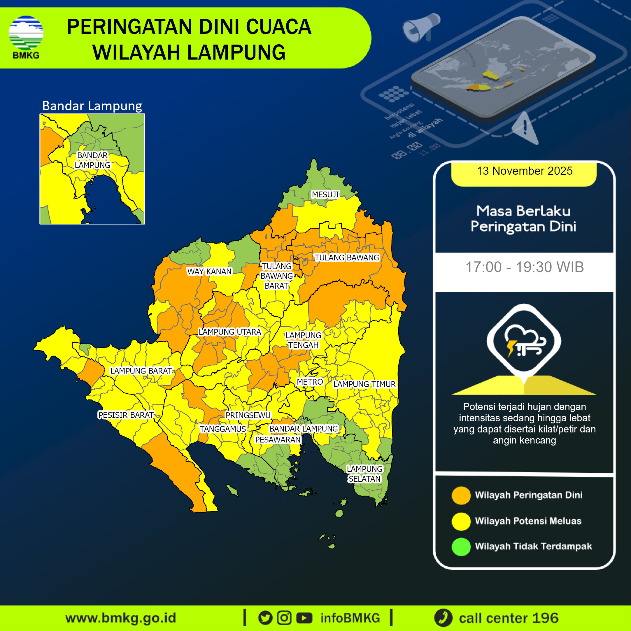 UPDATE Peringatan Dini Cuaca Wilayah Lampung tgl 13 November 2025 pkl. 16:50 WIB berpotensi terjadi hujan dengan intensitas sedang hingga lebat yang dapat disertai kilat/petir dan angin kencang pada pkl 17:00 WIB di Kabupaten Lampung Tengah: Bangun Rejo, Padang Ratu, Gunung Sugih, Terbanggi Besar, Bekri, Seputih Agung,.....