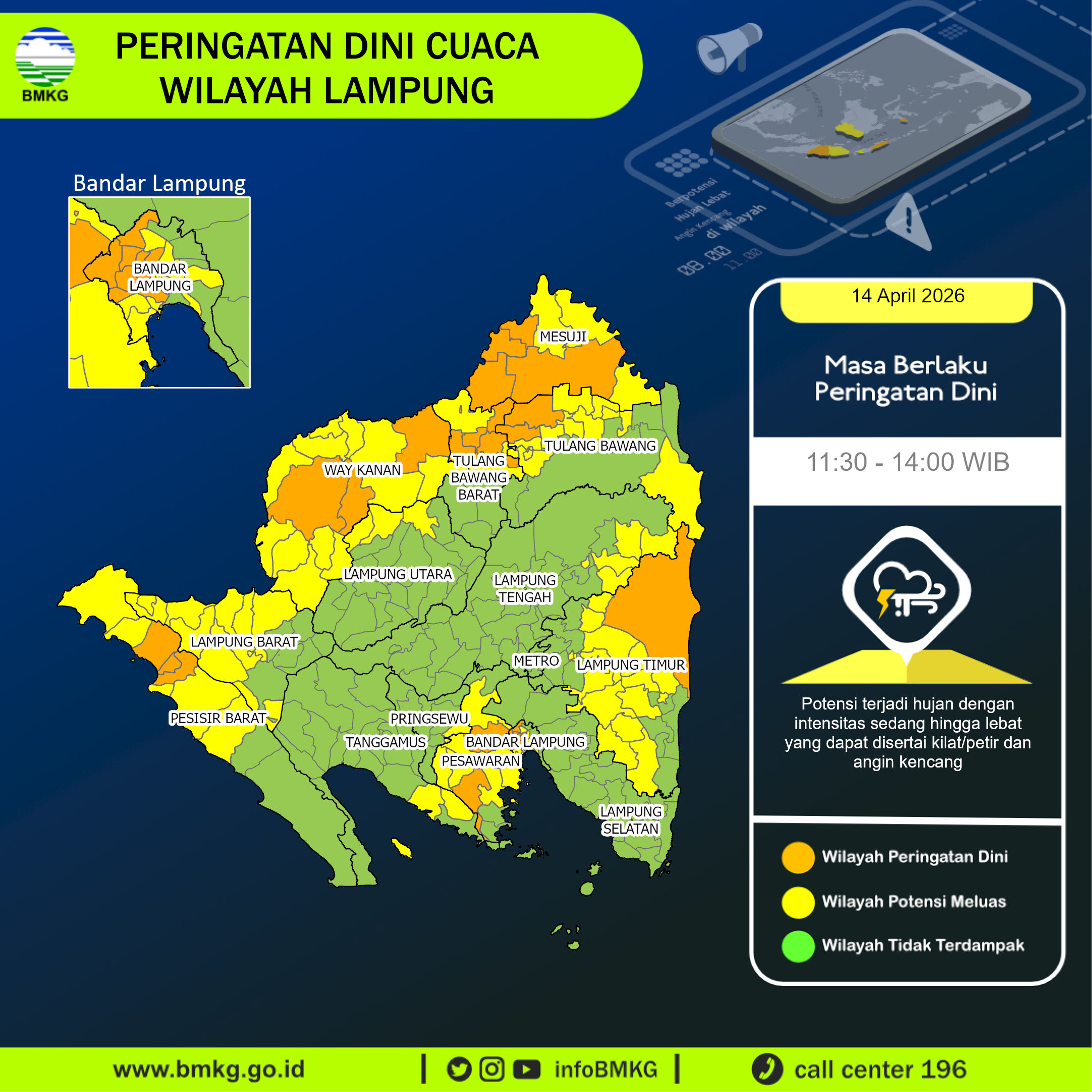 SelengkapnyaUPDATE Peringatan Dini Cuaca Wilayah Lampung tgl 14 April 2026 pkl. 11:15 WIB berpotensi terjadi hujan dengan intensitas sedang hingga lebat yang dapat disertai kilat/petir dan angin kencang pada pkl 11:30 WIB di Kabupaten Lampung Timur: Taman Nasional Way Kambas, Kabupaten Tulang Bawang: Banjar Agung, Banjar Margo, Kabupaten Way Kanan: Blambangan Umpu, Negeri Agung, Negara Batin, Kabupaten Pesawaran: Gedong Tataan, Way Ratai, Kabupaten Mesuji: Mesuji Timur, Way Serdang, Simpang Pematang, Panca .....
