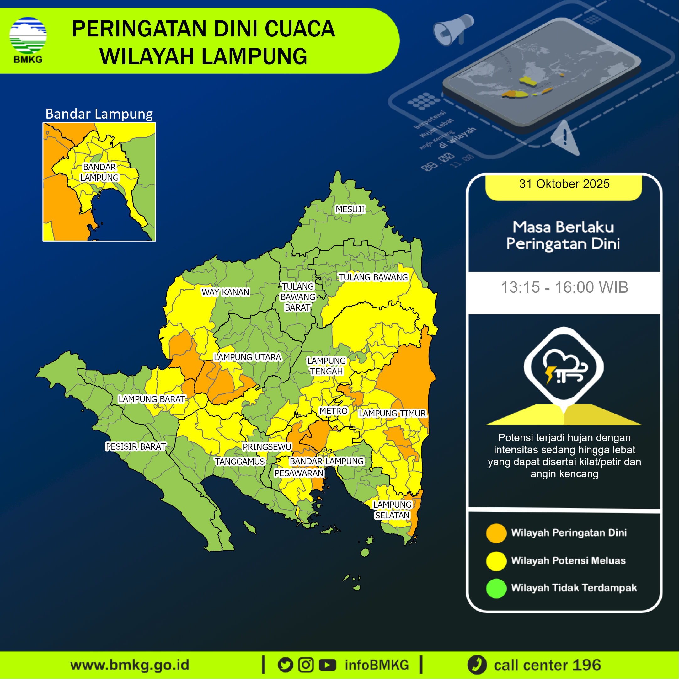 SelengkapnyaUPDATE Peringatan Dini Cuaca Wilayah Lampung tgl 31 Oktober 2025 pkl. 13:05 WIB berpotensi terjadi hujan dengan intensitas sedang hingga lebat yang dapat disertai kilat/petir dan angin kencang pada pkl 13:15 WIB di Kabupaten Lampung Timur: Taman Nasional Way Kambas, Batanghari Nuban, Bandar Sribhawono, Melinting, Labuh.....