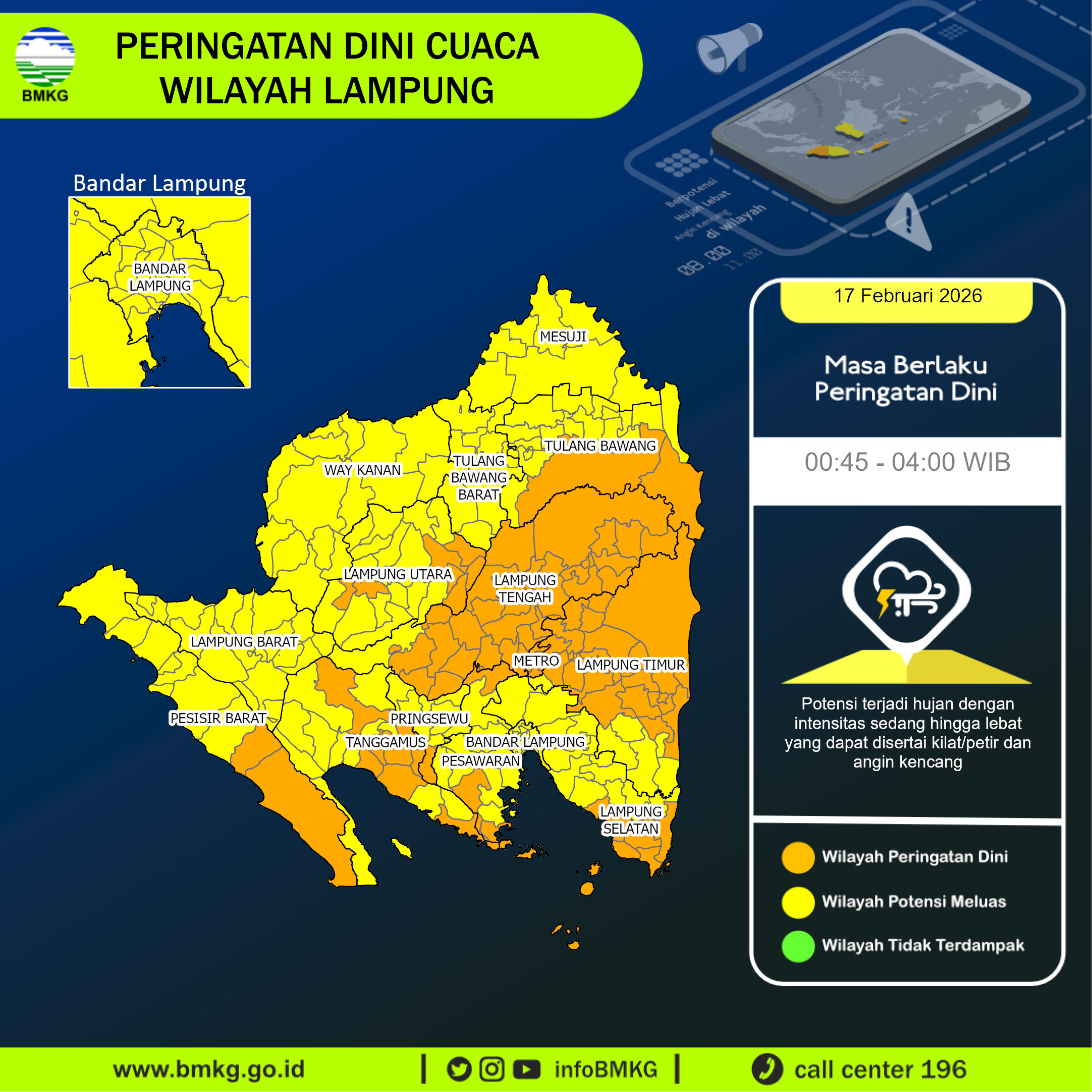 UPDATE Peringatan Dini Cuaca Wilayah Lampung tgl 17 Februari 2026 pkl. 00:25 WIB berpotensi terjadi hujan dengan intensitas sedang hingga lebat yang dapat disertai kilat/petir dan angin kencang pada pkl 00:45 WIB di Kabupaten Lampung Timur: Taman Nasional Way Kambas, Sukadana, Labuhan Maringgai, Pekalongan, Sekampung, Batanghari, Way Jepara, Purbolinggo, Raman Utara, Marga Tiga, Sekampung Udik, Batanghari Nuban, Bumi Agung, Bandar Sribhawono, Mataram Baru, Melinting, Labuhan Ratu, Braja Selebah,.....