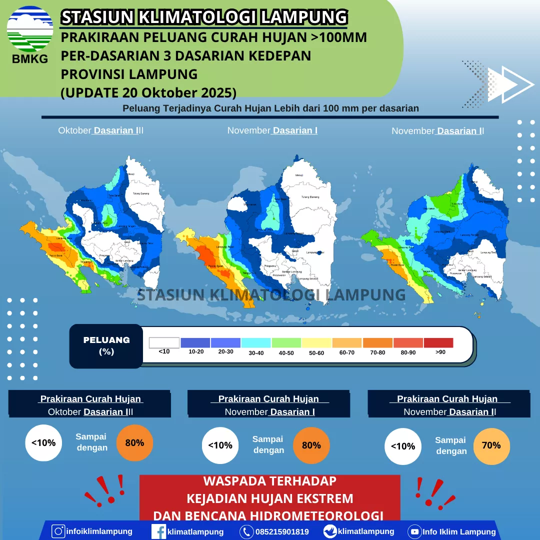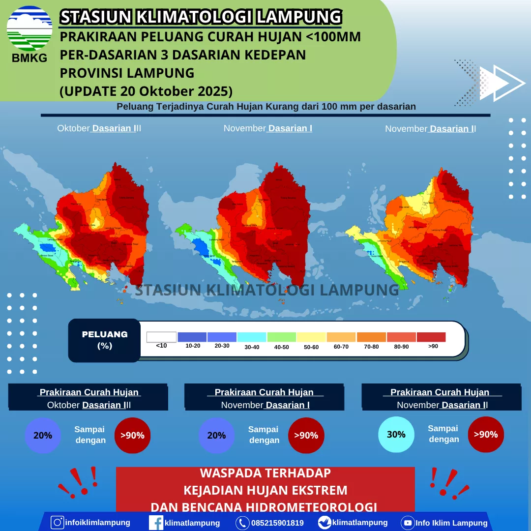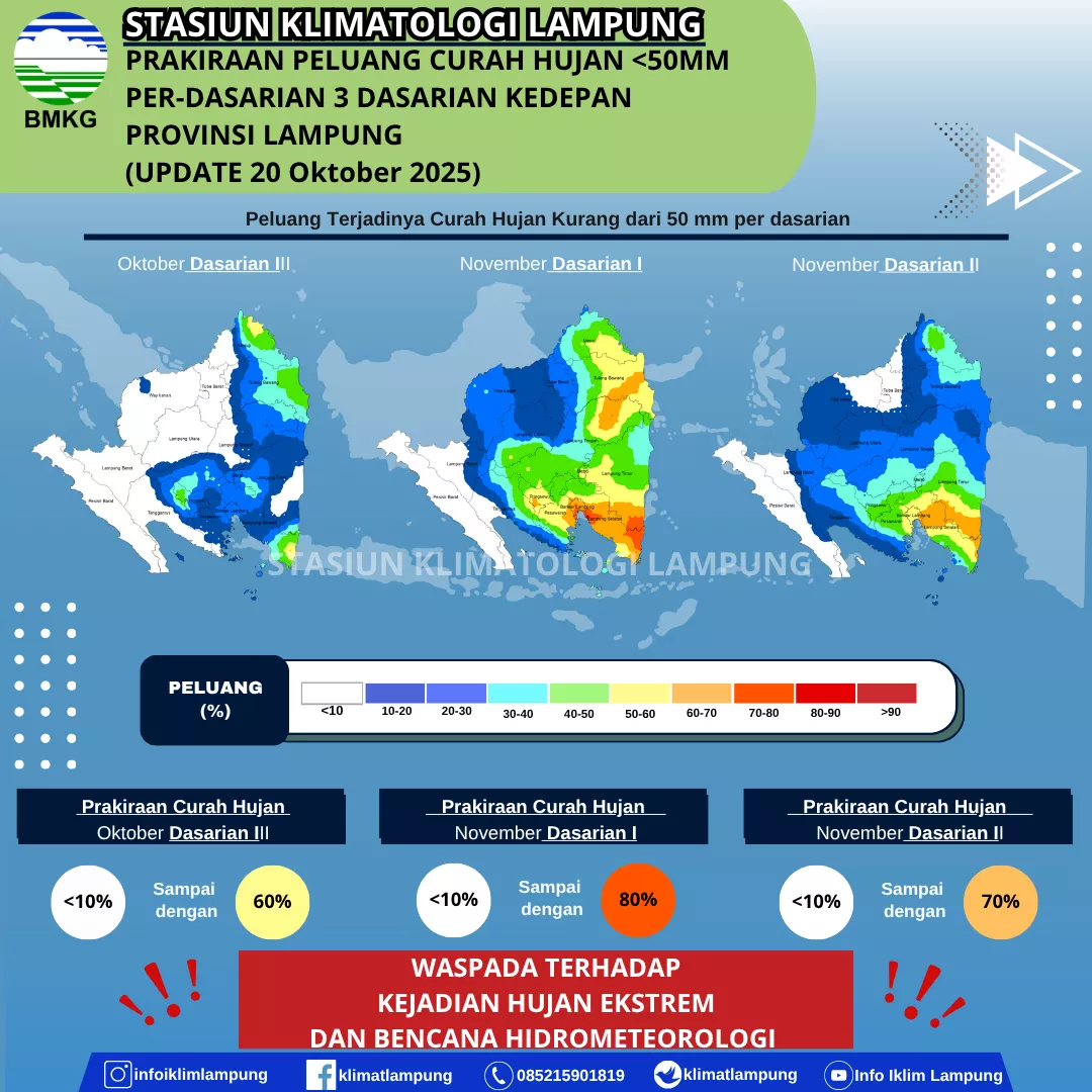 PRAKIRAAN CUACA PROVINSI LAMPUNG KAMIS, 23 OKTOBER 2025: Pagi hari: Diprakirakan cerah berawan - berawan. Berpotensi hujan di wilayah Pesisir Barat, Tanggamus, Pesawaran, Bandar Lampung, Lampung Timur, Lampung Selatan, Tulang Bawang, Mesuji.Siang-sore hari: Berpotensi hujan di wilayah Pesisir Bar...