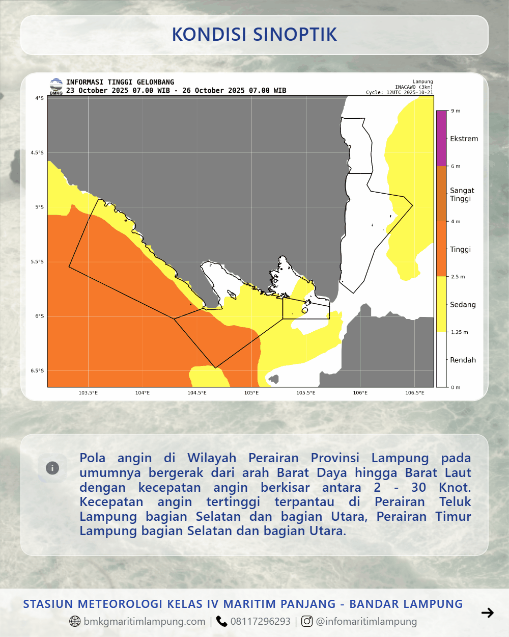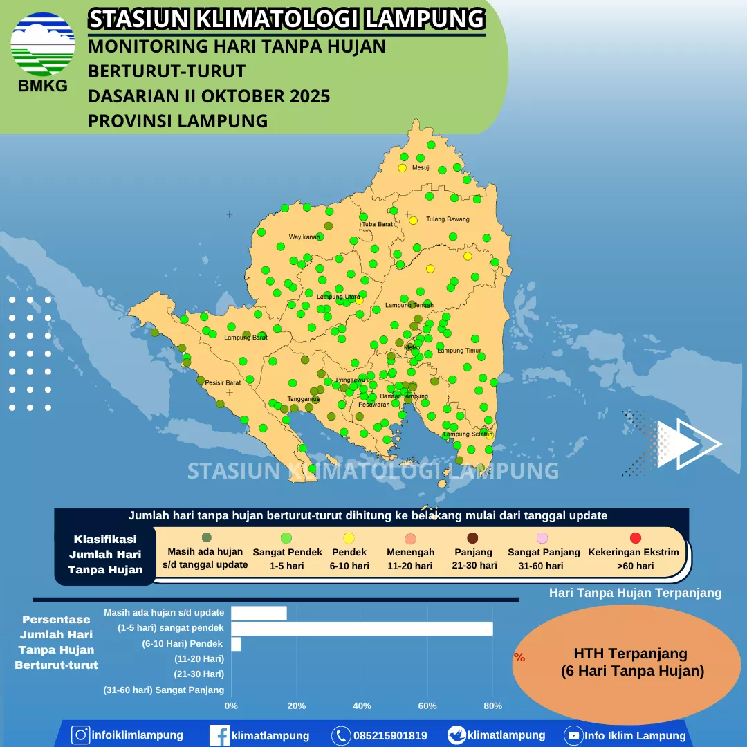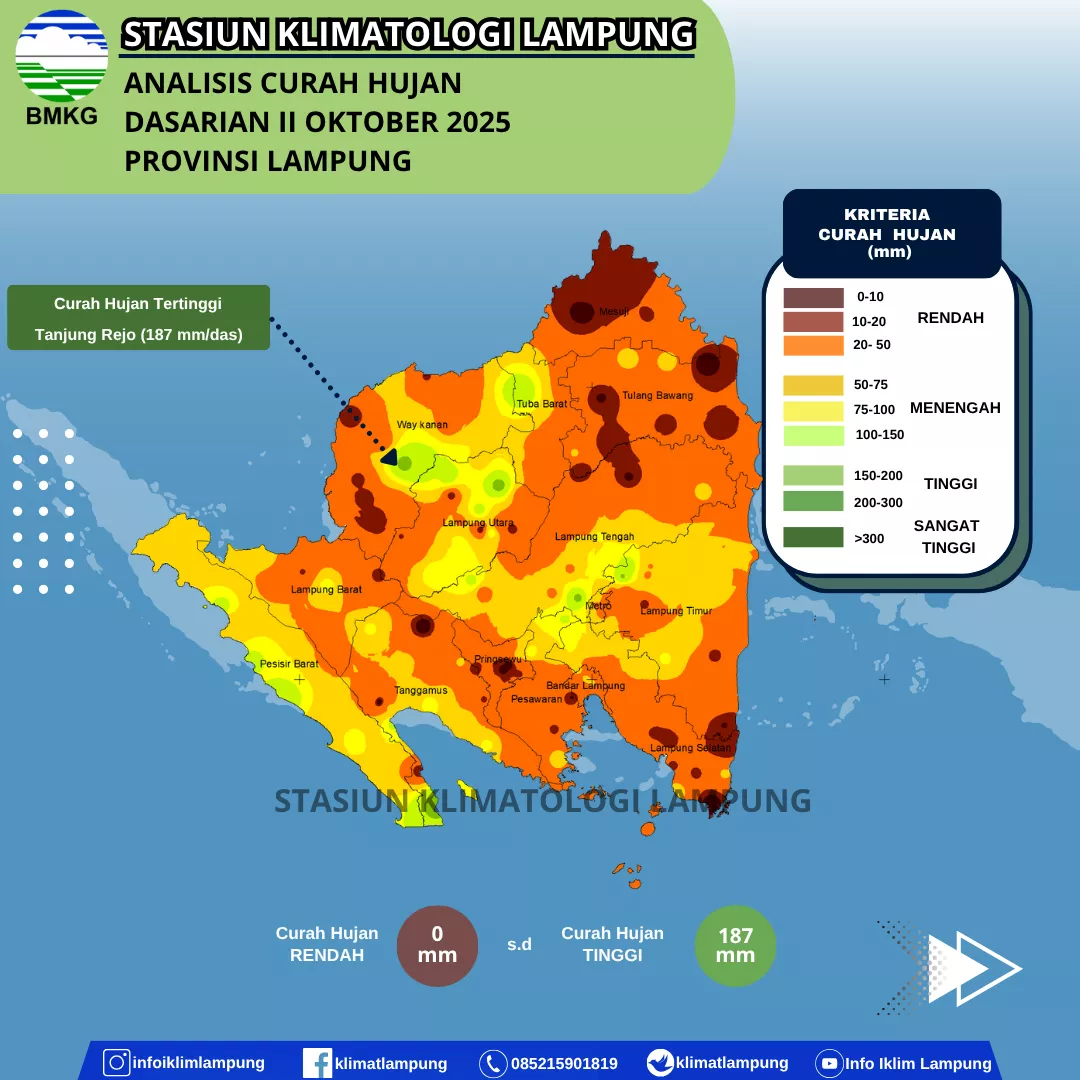 PRAKIRAAN CUACA PROVINSI LAMPUNG KAMIS, 23 OKTOBER 2025: Pagi hari: Diprakirakan cerah berawan - berawan. Berpotensi hujan di wilayah Pesisir Barat, Tanggamus, Pesawaran, Bandar Lampung, Lampung Timur, Lampung Selatan, Tulang Bawang, Mesuji.Siang-sore hari: Berpotensi hujan di wilayah Pesisir Bar...