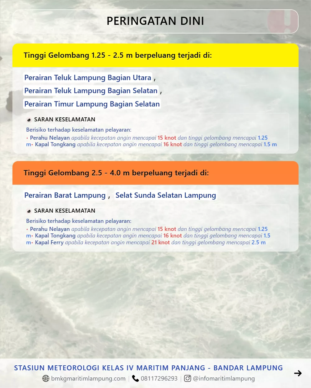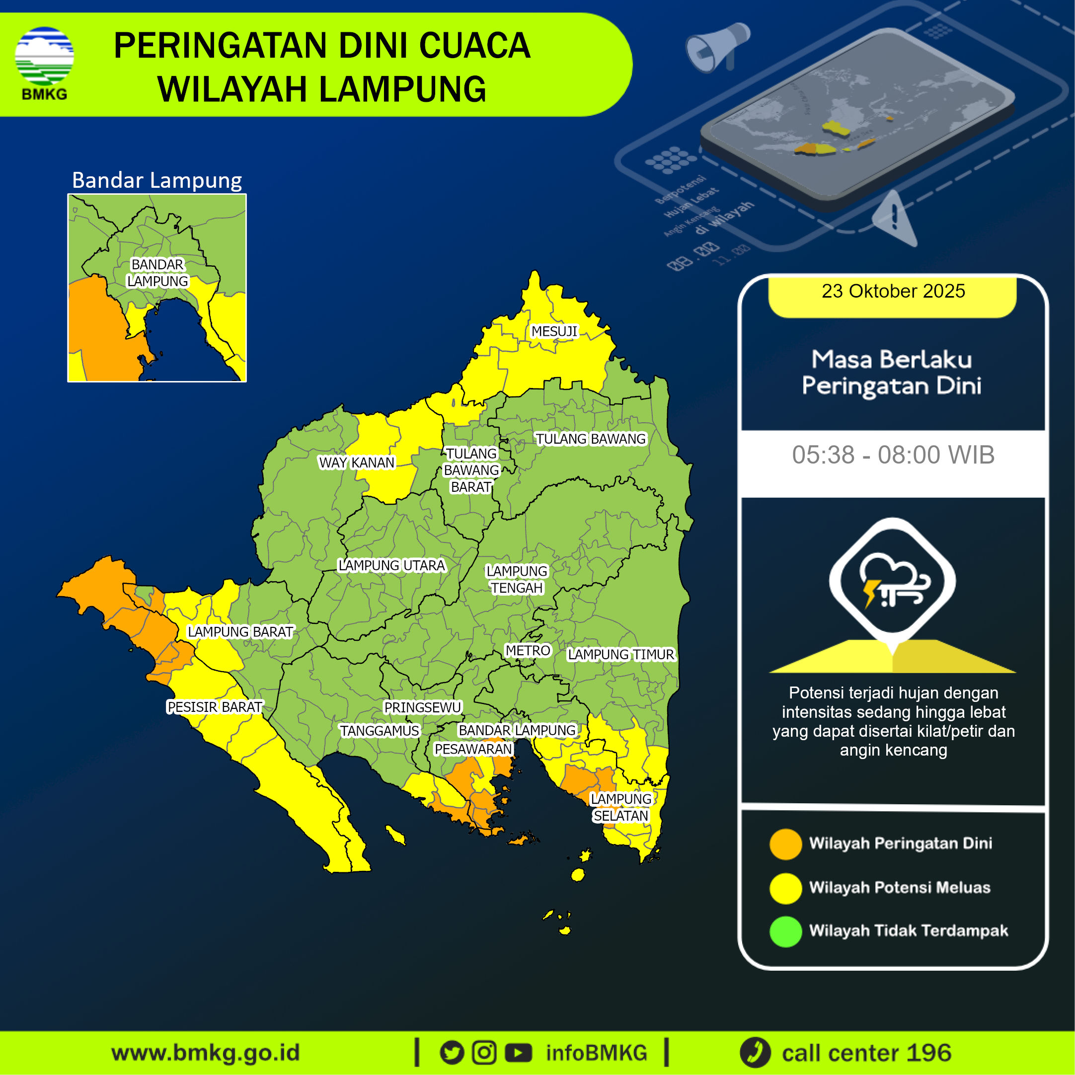 UPDATE Peringatan Dini Cuaca Wilayah Lampung tgl 23 Oktober 2025 pkl. 05:28 WIB berpotensi terjadi hujan dengan intensitas sedang hingga lebat yang dapat disertai kilat/petir dan angin kencang pada pkl 05:38 WIB di Kabupaten Lampung Selatan: Kalianda, Sidomulyo, Way Panji, Kabupaten Lampung Barat: Lumbok Seminung, Kabu.....