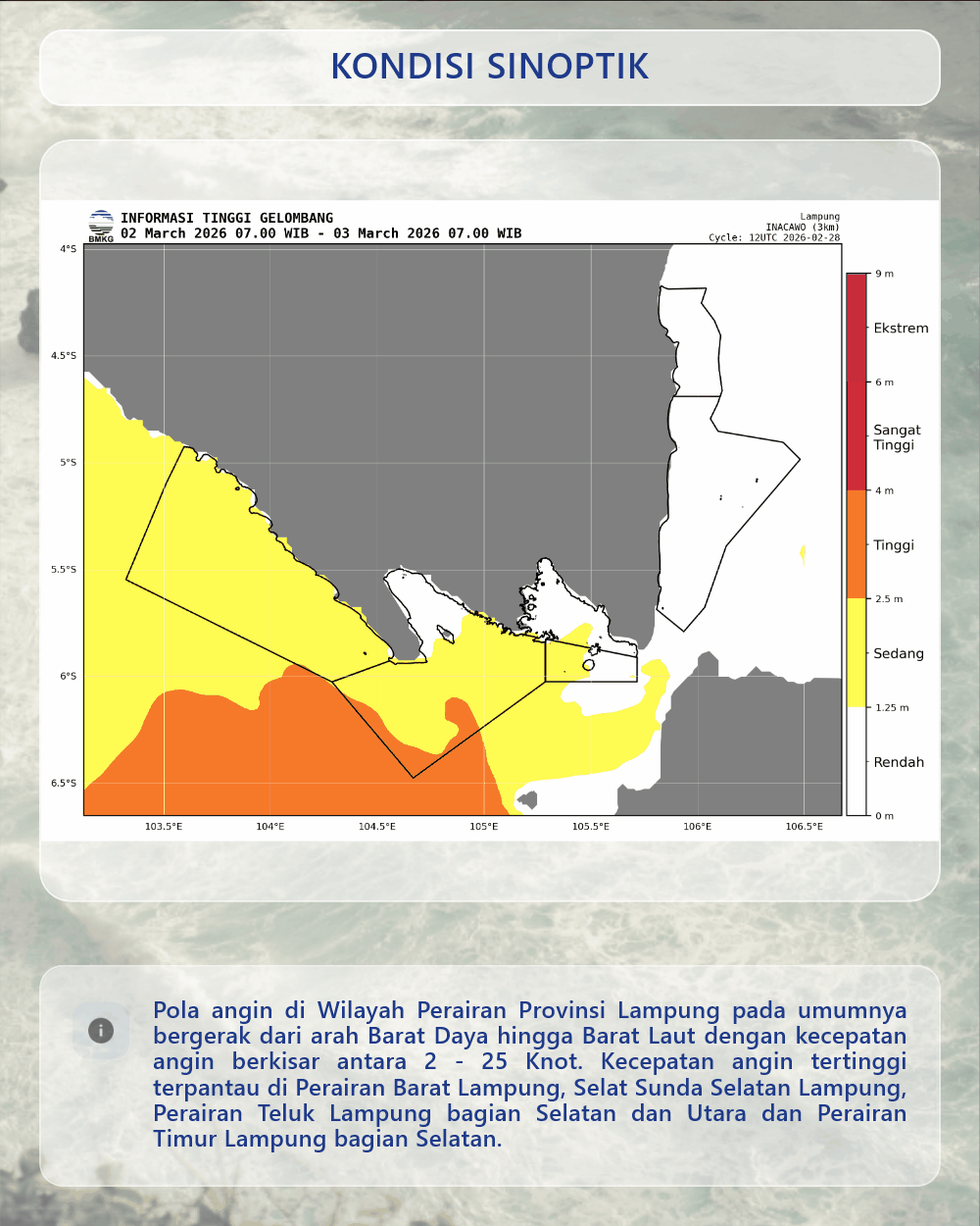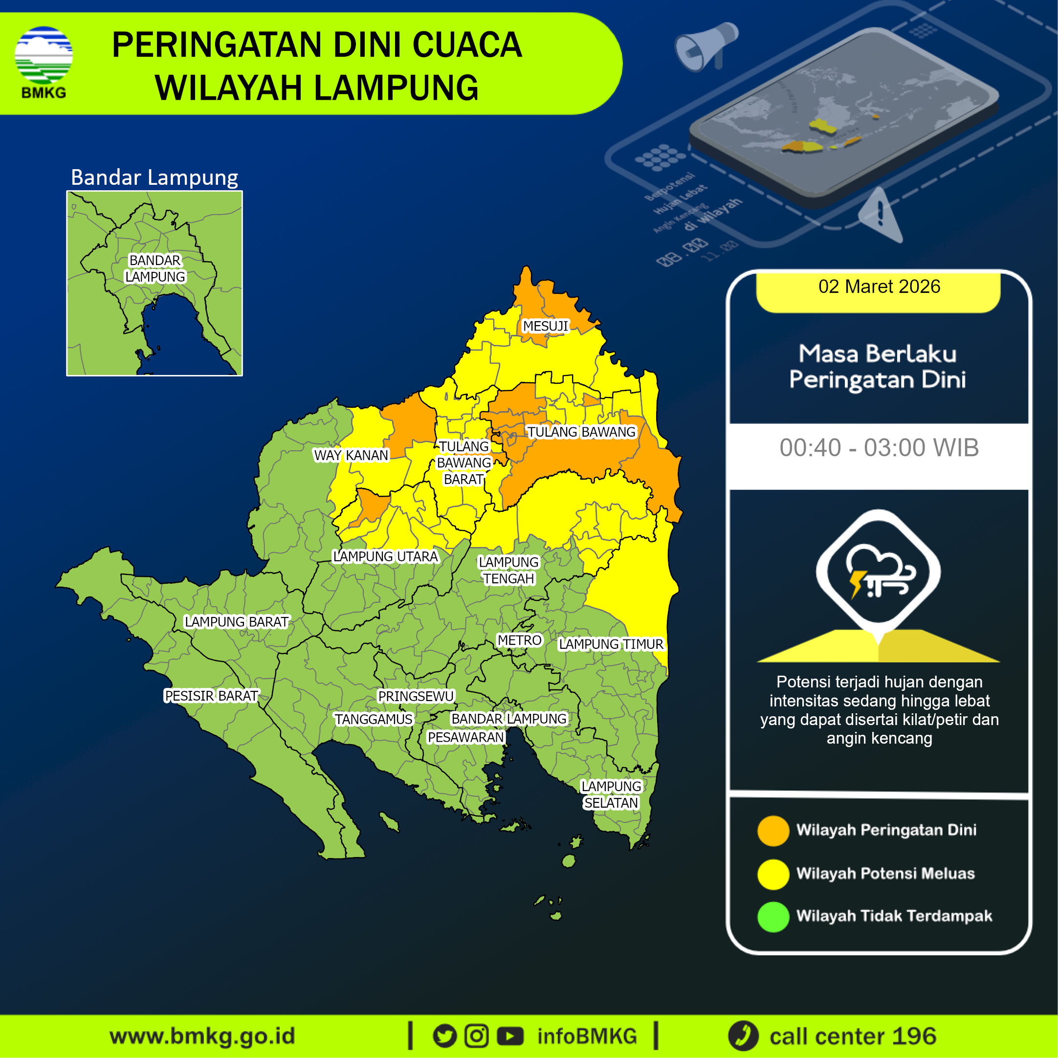 UPDATE Peringatan Dini Cuaca Wilayah Lampung tgl 02 Maret 2026 pkl. 00:30 WIB berpotensi terjadi hujan dengan intensitas sedang hingga lebat yang dapat disertai kilat/petir dan angin kencang pada pkl 00:40 WIB di Kabupaten Lampung Utara: Sungkai Utara, Kabupaten Tulang Bawang: Gedung Aji, Banjar Agung, Gedung Meneng, Banjar Margo, Dente Teladas, Banjar Baru, Menggala Timur, Kabupaten Way Kanan: Negara Batin, Kabupaten Mesuji: Mesuji, Tanjung Raya, Kabupaten Tulang Bawang Barat: Pagar Dewa Dan d.....