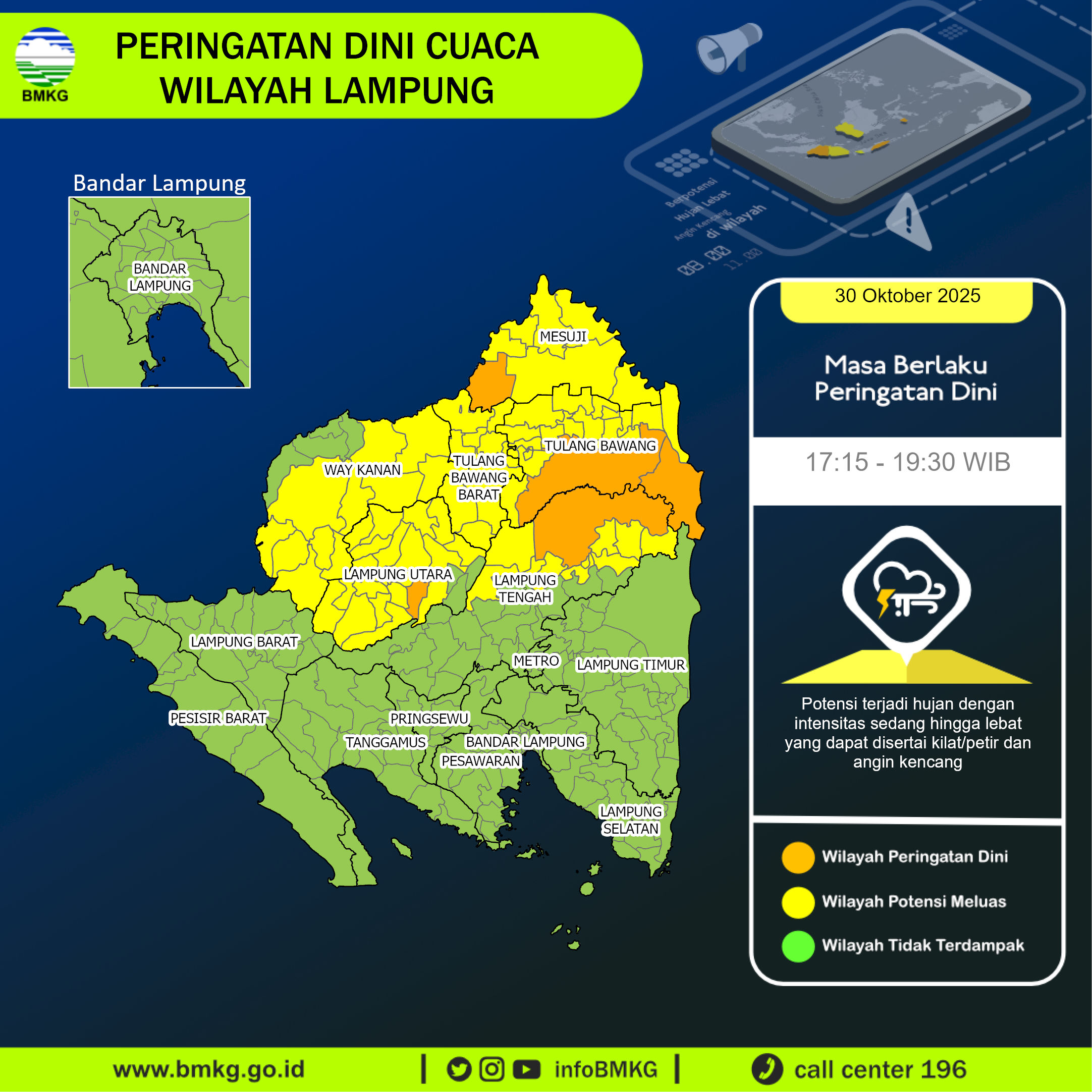 PRAKIRAAN CUACA PROVINSI LAMPUNG KAMIS, 30 OKTOBER 2025:Pagi hari: Diprakirakan cerah berawan hingga berawan. Berpotensi hujan ringan di wilayah Pesisir Barat, Pesawaran, Lampung Selatan, dan Tanggamus.Siang–sore hari: Berpotensi hujan sedang hingga lebat disertai petir di Pesisir Barat, Tanggamus,...