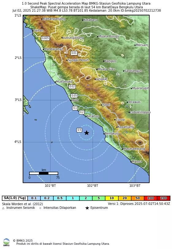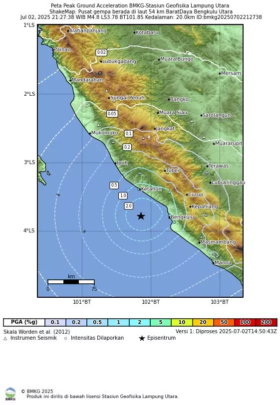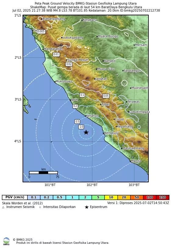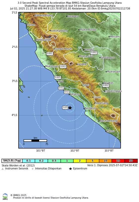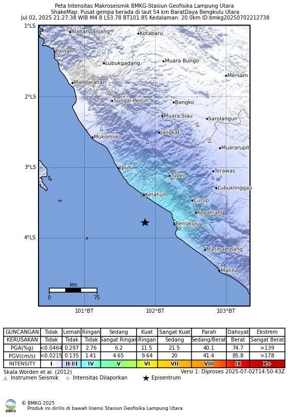 Disclaimer: wilayah II merupakan wilayah monitoring gempa bumi meliputi provinsi Lampung, Bengkulu, Sumatera Selatan, Banten, Jawa Barat dan Jakarta.Telah terjadi Telah terjadi gempabumi mag:5.0, lokasi:Pusat gempa berada di laut 129 km baratlaut Jailolo, waktu:03-Apr-26 17:59:05 WIB, kedlmn:10 Km, gempa ini dirasakan(MMI):II-III Bitung