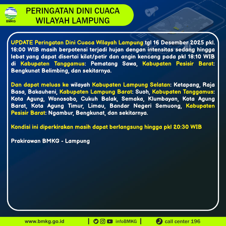 UPDATE Peringatan Dini Cuaca Wilayah Lampung tgl 16 Desember 2025 pkl. 18:00 WIB berpotensi terjadi hujan dengan intensitas sedang hingga lebat yang dapat disertai kilat/petir dan angin kencang pada pkl 18:10 WIB di